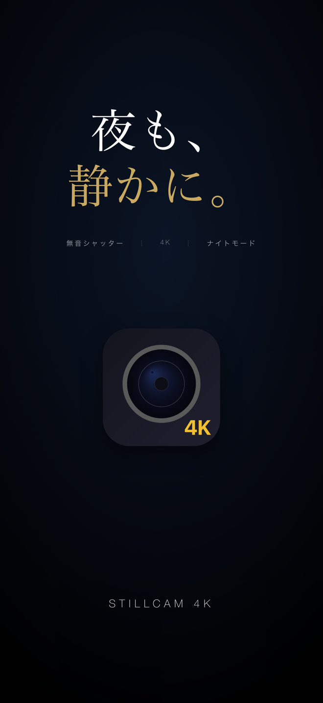 マナー対応の 4K カメラ。シャッター音以外、ほぼ何も主張しない静寂仕様。無料で試せて、広告除去は ¥400 の買い切り。サブスクなし。